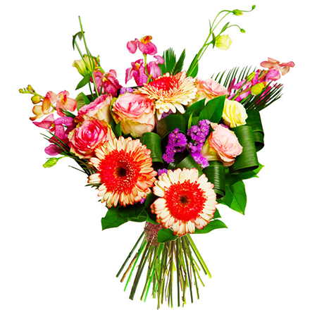 Bukiet z róż eustomy, gerbery, storczyka, zieleni dekoracyjnej.