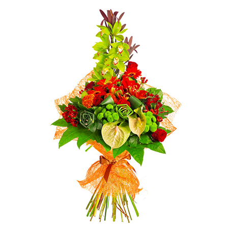 Bukiet składa się ze storczyka cymbidium,róż, anturium, gerber, margerytek, zieleni dekoracyjnej.