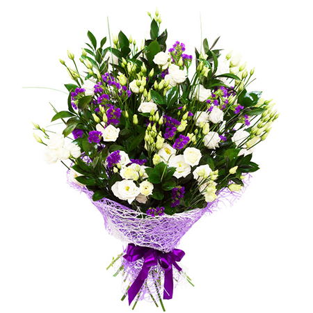 Bukiet z różnych biało purpurowych kwiatów z dodatkiem zieleni dekoracyjnej