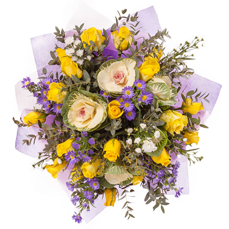 Bukiet składa się z żółtej róży, ozdobnej brassici, fioletowych i białych astrów oraz zieleni dekoracyjnej.