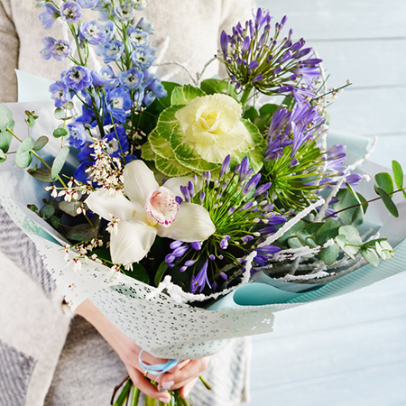 Piękny niebiesko biały bukiet z ostróżką, agapantem, eukaliptusem, brassicą i zielenią dekoracyjną.