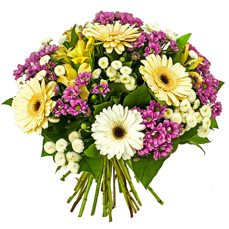 Bukiet składa się z gerber, santini, alstromerii oraz zieleni dekoracyjnej.
