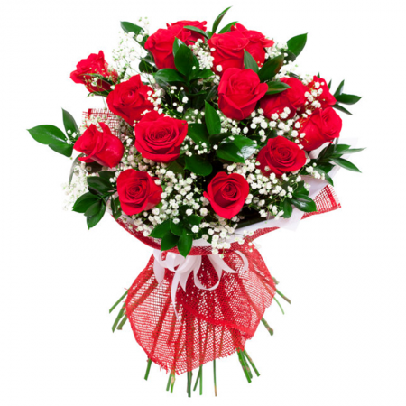 Bukiet 15 czerwonych róż z gipsówką i zielenią dekoracyjną.