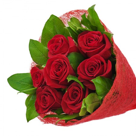 Bukiet czerwonych długich róż z delikatnym przybraniem, otulonych fizeliną.