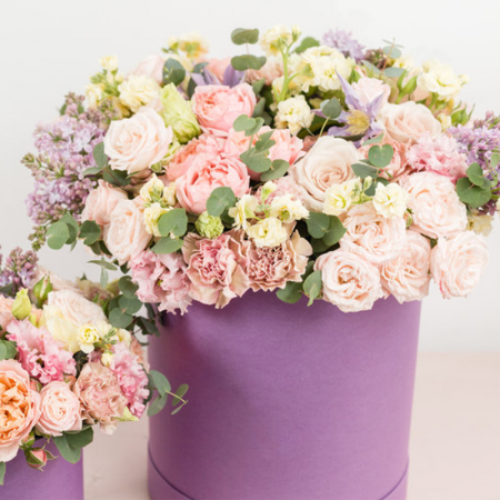Box składa się z  róż, goździków, gerber, eustomy, zieleni dekoracyjnej.